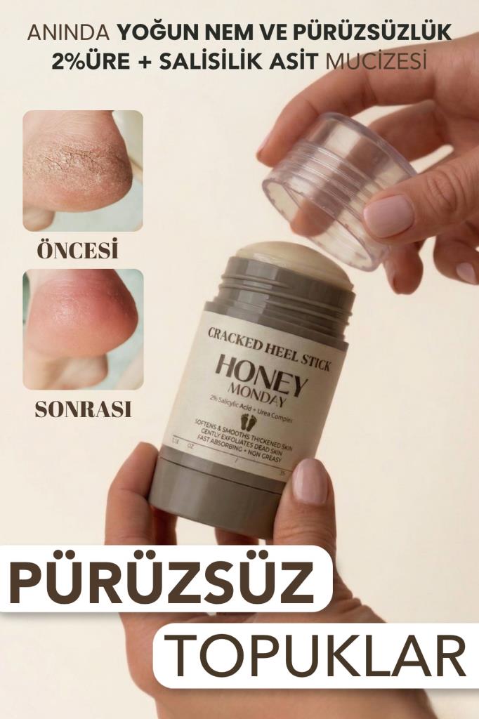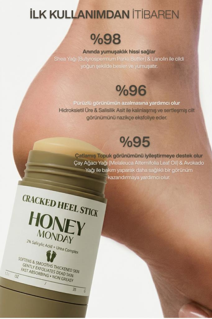 Bu içerik güçlü bir topuk onarıcı / keratolitik bakım ürünü olarak formulize edilmiştir. Özellikle Ürevi Nemlendiriciler + Yağlar + Salisilik asit kombinasyonu sayesinde çatlak, sertleşmiş ve kuru topuklara hitap etmesi hedeflenmiştir. Özel balm-stick formu sayesinde pratik kullanım sunar, cilt üzerinde konforlu bir tabaka oluşturarak daha pürüzsüz, yumuşak ve bakımlı bir topuk görünümü elde etmeye yardımcı olur.
